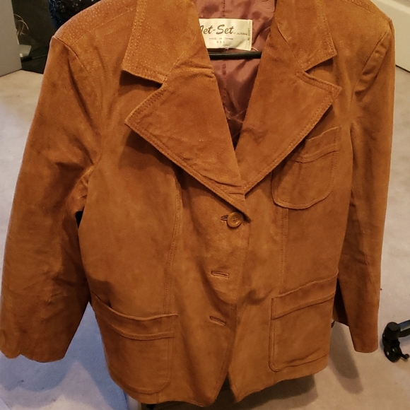 Genuine 100% suede leather ladies blazer. Size 14 or large. Front has 3 buttons & pockets. Detailed stitching.
