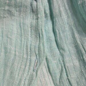 Pretty blue light weight button front blouse. Lace across top, 3/4 sleeves /roll up. Size is 14/16W. Missing the last button ,it doesn't interfere with the closure of the top, it stays together.