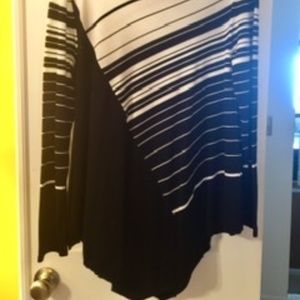 Round scoop neck....black and white...size XLarge...70% rayon...30% polyester. Turn garment inside out...machine wash cold...gentle cycle...reshape...flat to dry...cool iron.