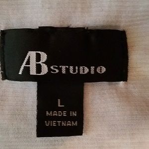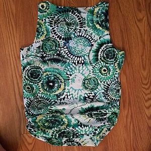 AB Studio Sleeveless top, size large, green, black and white color with side rueshing on the bottom, 100% polyester lining and shell.