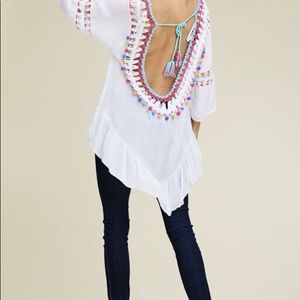 Crochet lace ruffle top with Pom Pom. 3/4 sleeve, ruffle, open back, back tie, tassels and high low hem. Soft and snug material.