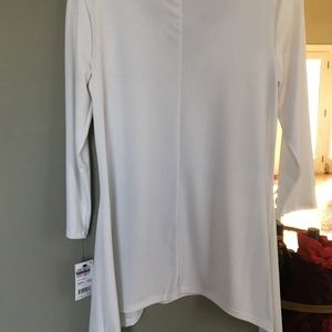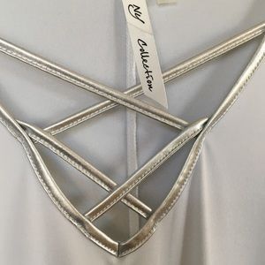 NY Collection top. Brand new with tags attached. White polyester with silver cross cross detail at neck. Hem line at bottom is s little longer on the sides. Size is XS but is more like a small.