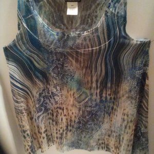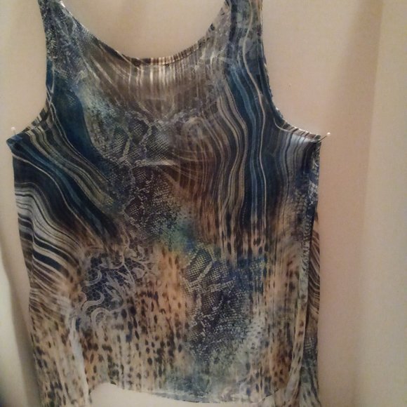 Size M, ladies sheer summer top. 100% polyester, exclusive of decoration. Made in USA