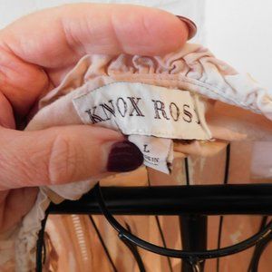 Ladies top by Knox Rose. This casual top in peach in color with long sleeves that are button cuffs. This top has a round neckline with a draw string tie at neck.