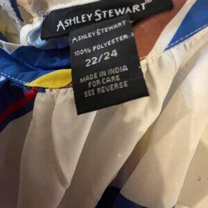 Sleeveless ladies top. Top is white with multiple colors of blue, yellow, brown and flowers of red and orange. Top has a 2-button opening on the back collar. Top is brand new and never worn, but the original tag is missing.