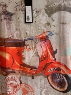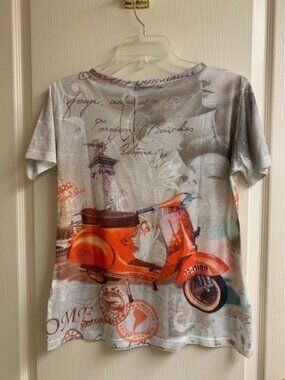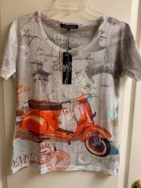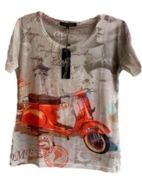 Super cute ladies top made by Compliments. Fun style❤️with beautiful Orange Vesper scooter. 100% Polyester and machine washable for convenience! Looks great with jeans. Size is small but could fit medium.
