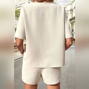 Solid Waffle Two-piece Set, Crew Neck Short Sleeve Tee & Drawstring Shorts Outfits, Women's Clothing Beige