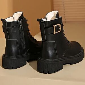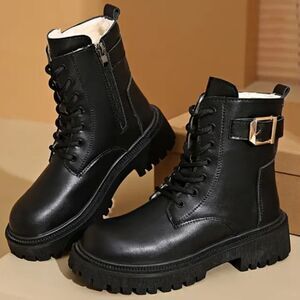 Women'S Solid Color Combat Boots, Tied Round Head High Top, Warm Non-Slip Platform Shoes, Outdoor Matching, Zipper Closure, Round Toe, Chunky Heel, Faux Sole, Fabric Lining, Mid-Heel Height, Synthetic Upper