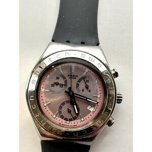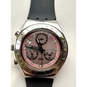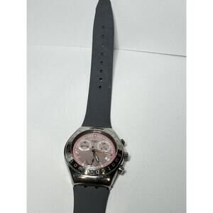 Discover this stylish and functional Swatch Chronograph watch, featuring a captivating pink dial and a durable grey band. This comes with a new, high-quality Renata battery and keeps perfect time.