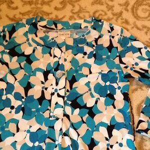 Pretty flowered pull on style dress with 3/4 sleeves from Chico's in size 0. Pretty poly blend with vibrant colored flower all over. NWOT. Front has a one button opening. Measurements are as follows: bust 32", waist 34", hips 36", length 34".