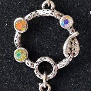 Beautiful oval off white carved flowers are set in antiqued silvertone , above that is a circle vine with clear rhinestones. These dangle from fish hook findings. Hang 1 1/2". New in pkg.