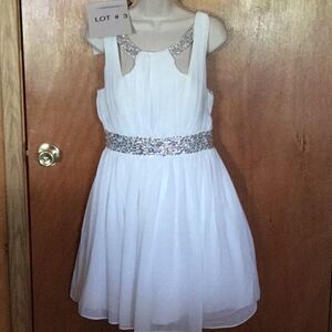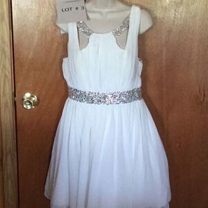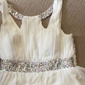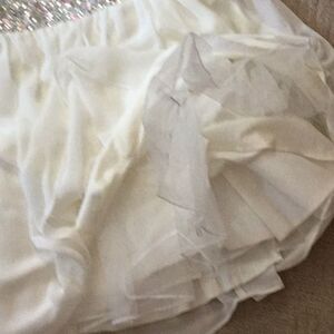 Super cute little size 11 jr. dress for formal event . Color is cream, back zipper, with back gathers, front top pleating, beading around waist & at neckline. Skirt is a crepe like material, with layers of tule to make skirt full. Built in bra. In excellent preowned condition. Measurements are as follows: bust 32”, waist 28”, hips 36”, dress length 33”.
