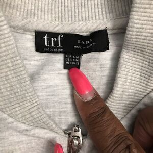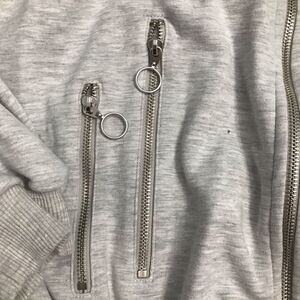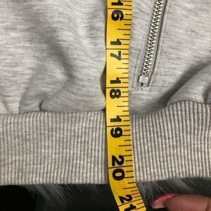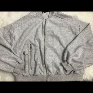 Ladies gray oversized full zip sweatshirt with zipper front pockets. Excellent condition. Ladies size small-medium. Chest 24” length 20”