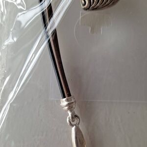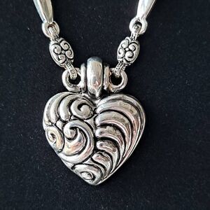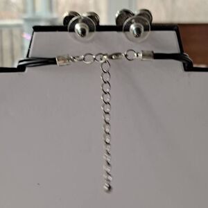 Really pretty silvertone set! Earrings are on post with metal and rubber backs . 5/8" long. 16" Necklace has black cords joined in back with lobster claw clasp closure and 3" extender. Front, stations of silver beads and sliders meet heart in center front. Very pretty!