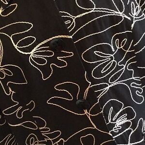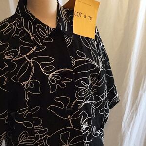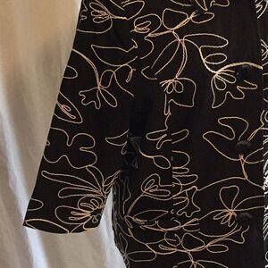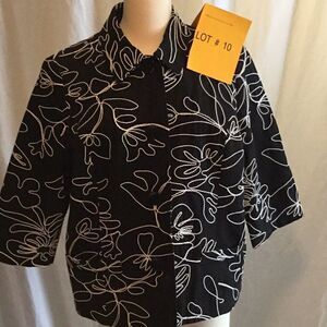 NWOT jacket with big front button closures, 3/4 length sleeves, jacket is black with white raised embroidered design. Size is 14 by NKD. Measurements are as follows : bust 46”, jacket length 25”, sleeve length 17”. Slightly padded shoulders. Faux front pockets.