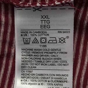 Deep red and tiny white stripes, size XXL. Banded crewneck pullover with long sleeves and a slight shirt tail hem. Soft and comfortable fabric is 100% cotton. Measures 23" pit to pit, length is 27".