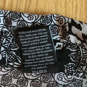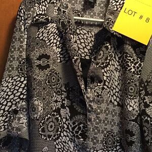 Pretty lightweight 100% polyester blouse that has the look of crepe. Button front with a solid black faux under tank. Very cute. 3/4 sleeves. In excellent preowned condition. Measurements are as follows: bust 50”, top length 26”.