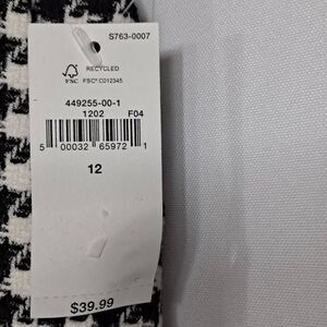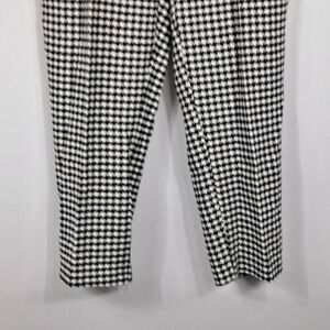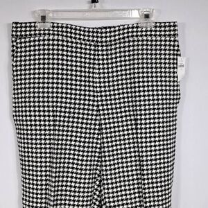 Black and white houndstooth, size 12. Flat front waistband, elasticized back. Front pockets, faux welt rear pockets. Fabric is 63 polyester, 33 rayon and 4 spandex. Measures 34" waist, inseam is 26".
