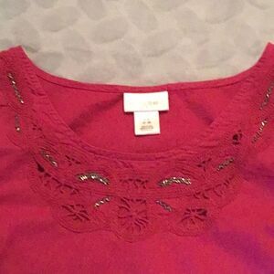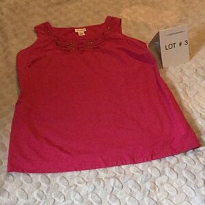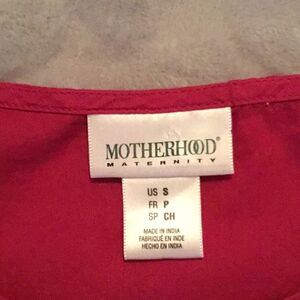 Bright pink sleeveless maternity top in size small. Cute open weave design at neckline with beading. Cotton. From MOTHERHOOD. Measurements are as follows: bust 36 to 38”, top length 26 1/2”. In very good preowned condition.