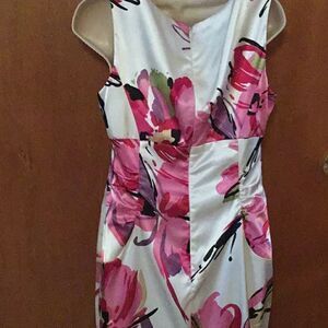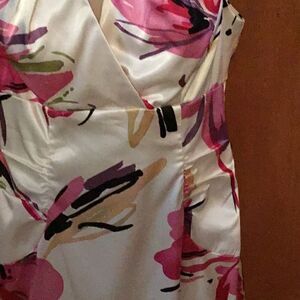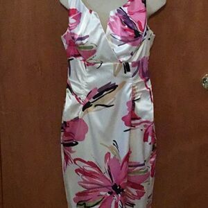 Gorgeous cream colored sleeveless dress with bold colored flowers. Silky material with some stretch to it. NWOT from DRESSBARN. Top is lined. V-neck plunging neckline. Fitted in thru middle. Back zipper. Very sexy! Measurements are as follows : bust 36”, waist 32”, hips36”, length 38”.