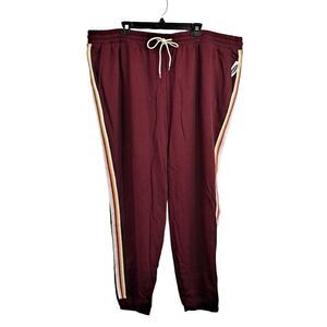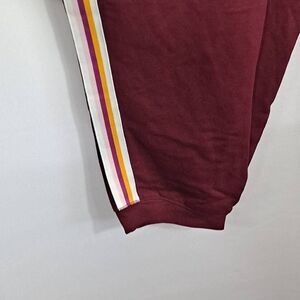 Maroon with white, yellow and pink side stripes.   Size 3x.  Pullon style, elasticized waistband with drawstring.   Front pockets and jogger leg bottoms.   Fabric is 52% cotton,  48% polyester.   Measures 48" waist,  32" inseam.  Cute and comfortable!