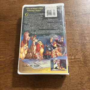 This is a fully restored VHS tape of the classic Disney movie, Lady and the Tramp. The film is presented in its original aspect ratio and has been remastered to ensure optimal picture and sound quality. This masterpiece is a must-have for any Disney collector or fan of the beloved animated dog, Lady, and her adventures with a group of stray dogs. The tape is in the VHS format and is compatible with all VCR players.