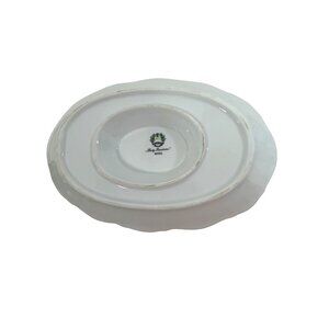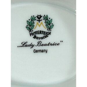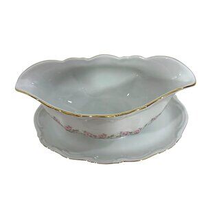 0631B- Vintage Lady Beatrice Collection porcelain gravy boat with attached underplate, by Mitterteich, crafted in Bavaria, Germany, 1920s pattern, now discontinued. Features a design of small pink roses and daisies, with gold trim, and raised porcelain details and scrolling, oval, 8.5” long, 5.75” wide, 3.5” tall. Lovingly preowned. Excellent condition. (Bottom shows signs of shelf wear.) See photos.