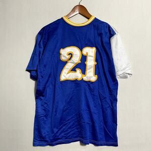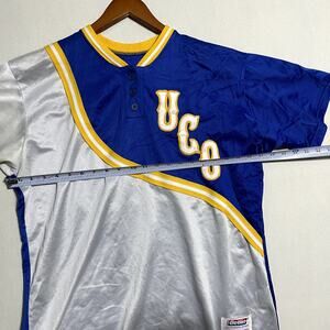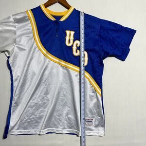 Vintage Betlin Quality Athletic Apparel baseball style jersey, size XXL. The jersey features a blue, white, and yellow color scheme, with a unique curved color-block design across the chest. "UCO" is stitched on the front in white with a yellow outline, and the number "21" is on the back in the same font and colors. The sleeves and lower body are made of white mesh, while the chest and back are a blue mesh. It has a V-neck and a 3-button Henley placket. This style is consistent with athletic apparel, possibly for the University of Central Oklahoma Bronchos, whose colors are blue and bronze (a shade of yellow/gold), and whose nickname is UCO. This is a vintage piece made in the USA by Betlin. Great for a collector, UCO fan, or a retro sports look.