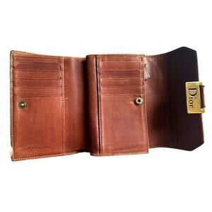 Vintage Lady Dior trotter street chick wallet. Navy blue jacquard logo fabric exterior with beautiful deep mohogany leather flap and interior. Zippered coin pouch, multiple card slots and 2 larger slip pockets and one thinner slip pocket.