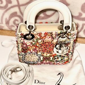 This gorgeous purse was a Christmas gift from my wife's boss a few years ago. A beautiful piece of pearl white leather lined in satin and embroidered with geometric shapes made with multi-colored rhinestones (I think some people call it rhinestones too). The embroidery is in perfect condition with no broken threads or missing stones. It measures 7.25 inches wide, 3 inches deep, and 6 inches tall without the handles, with the handles it measures 9 inches.My wife used it as a clutch once and then put it away in the closet. It comes with the original Dior bag. It has no alterations whatsoever. The original price of this wallet when it came out was $7,900. My wife actually used it only once and kept it in a closet. It comes with the leather shoulder strap and the original Dior bag.