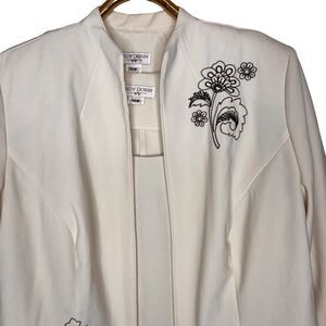 This Lady Dorby 16W Ivory Jacket and Camisole with Black Floral Embroidery is an easy to care for career set is perfect with a black skirt or pants. With the open front, collarless, and 3/4 sleeve design, this look is classic and practical. The ivory color is accented with beautiful black floral embroidery and is made from a polyester material that is easy to care for.