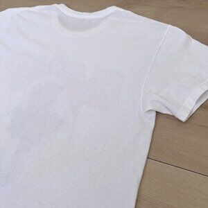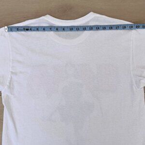 Nice baggy drape and wider neckline to this boxy cut white tee. The bold print totally captures the 80s metal band tee aesthetic, featuring her iconic 'The Fame' album look and holding her infamous disco stick. Paws up, Little Monsters!