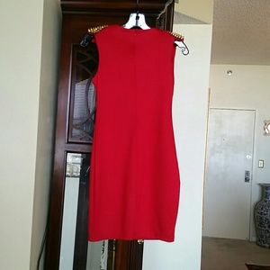 You'll love wearing this super fun red mini dress- it will make you the life of the party! I gave it a wear or two but it's not me anymore....Made and bought in Israel. Metal spikes on defined shoulders. High neck. Hits mid theigh. Red material.