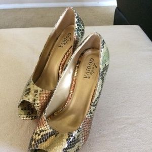 These beautiful faux snakeskin and faux wood Platform Pumps are so stunningly sexy. The heels measure approximately 5 and 1 quarter inches! All man made materials. There are some visible signs of wear as shown in pictures, but not to noticeable depending on personal preferences.