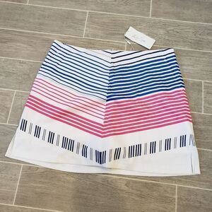 LADY HAGEN Bon Voyage Collection blue, pink and white chevron print skort - Size 14. Fabric is 96% hydro-dri polyester, 4% spandex and it is tag recommended machine washable.