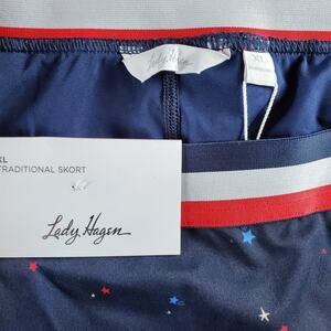 New Lady Hagen Womens XL Pull On Contrast Trim Print Skort Navy Star Print. Moisture wicking, breathability, wrinkle resistant, 2 front pockets and 1 back pocket. Approximate measurements, waist 38in, length 17in.