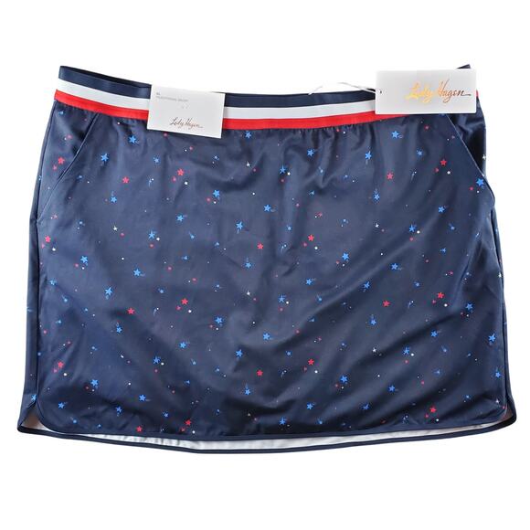New Lady Hagen Womens XL Pull On Contrast Trim Print Skort Navy Star Print. Moisture wicking, breathability, wrinkle resistant, 2 front pockets and 1 back pocket. Approximate measurements, waist 38in, length 17in.