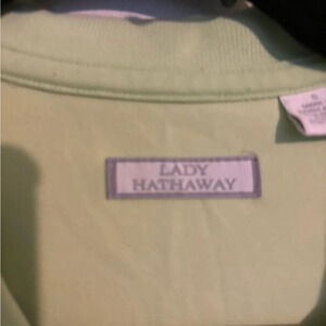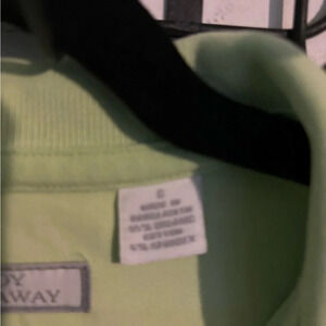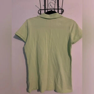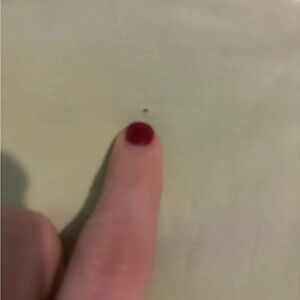 Small pinhole on back below collar. My daughter popped the tag, but she never wore it. Extra button on care label.