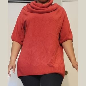 The sweater Cowl neck or turtleneck style collar. The sweater doesn't have any decor its just a casual plain sweater.