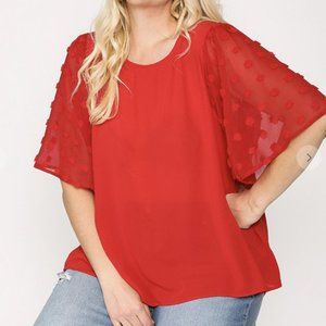 This Plus Size Lady In Red Top Will Have Everyone Noticing You When You Walk In The Room! This Stunning Red Color Is Gorgeous! Plus It Features A Round Neckline, Ruffle Sleeves, Contrasting Fabric And A Swingy Top. 100% Polyester, Wash Cold