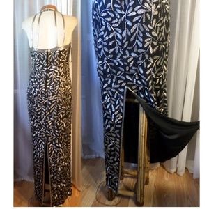 This is a vintage Laurence Kazar (M) long formal gown. The sequins and beads are stunning and the shoulder straps are unique. The high neck and open back make it modest and sexy at the same time. BUST: 18" side seam to side seam. Waist: Narrowest Point. 16" HIPS: 17" at widest point. LENGTH: 53". MATERIAL: 100% Silk. Polyester Lining. There are no rips, stains, snags, discolorations, odors or patches of missing beads or sequins. It was gently pre-owned and carefully preserved.