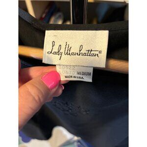 • Tags: black blouse, Lady Manhattan blouse, medium size blouse, embroidered blouse, short sleeve blouse, polyester blouse, made in USA, elegant blouse, womens top, black top, medium top, embroidery detail, dressy blouse