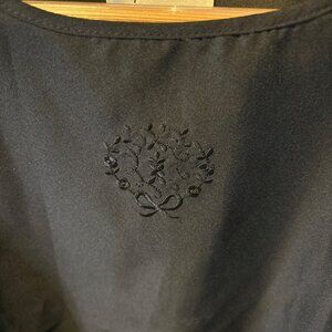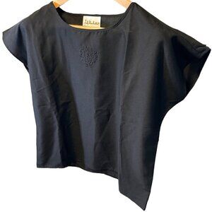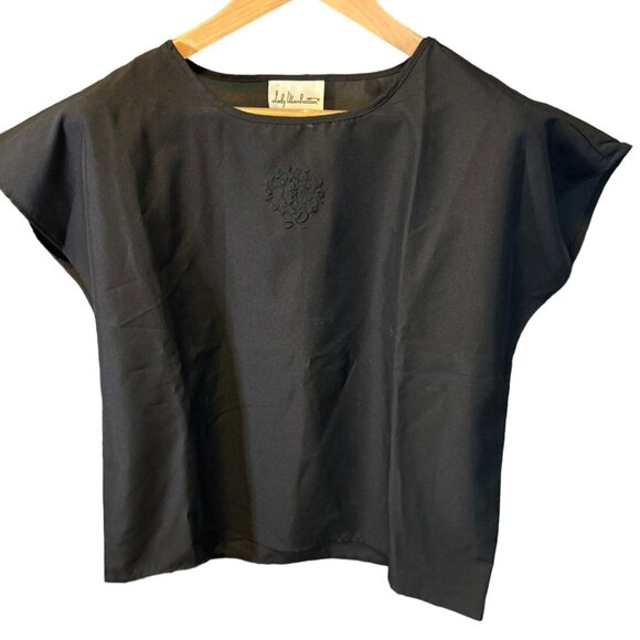 • Tags: black blouse, Lady Manhattan blouse, medium size blouse, embroidered blouse, short sleeve blouse, polyester blouse, made in USA, elegant blouse, womens top, black top, medium top, embroidery detail, dressy blouse