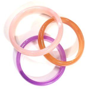 Bangle on, baby! This stack of bangles features marbleized acrylic in shades of butterscotch grape, and pink.