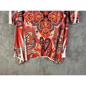 Lady Noiz Blouse XL Red Paisley Boho Asymmetric Hem Rhinestones 3/4 Sleeve