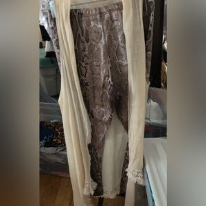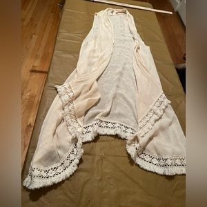 Lady Noiz size large ivory gauze like open front long vest / cover up with fringe trim