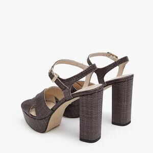 Wide heel sandal with crossed straps in raffia. Buckle fastening at the ankle. The sole is very cushioned for comfort.