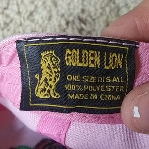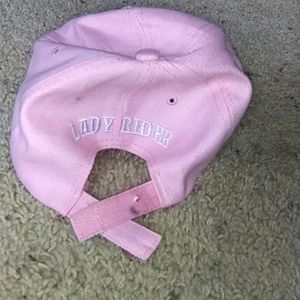 Pink baseball style cap 'Lady Rider' with red rose detail and pink lined detail behind colored centered rose. Velcro adjustment.