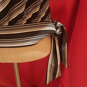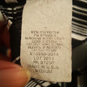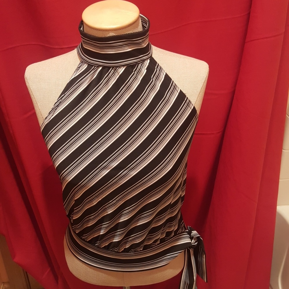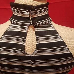 Black, White Halter top. Tie at waistline, and buttons on the back of neck. In good condition no pulls or snags.