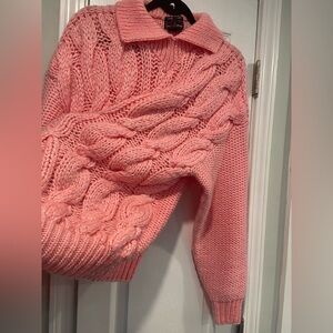 Hand knit chunky cable knit bubblegum pink pullover collared